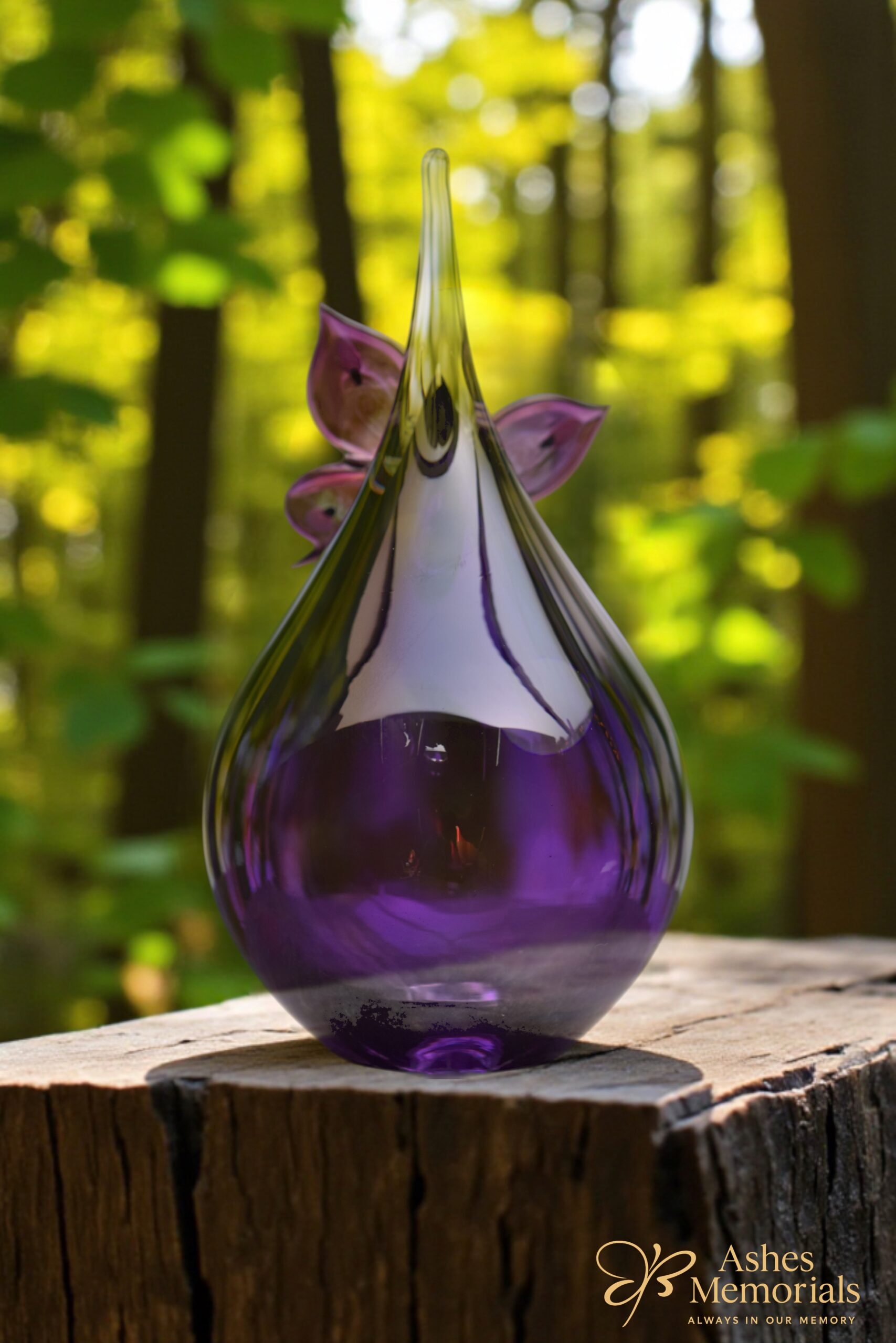 Handmade medium glass urn with butterfly in transparent purple glass. Suitable for a small amount of cremation ashes.