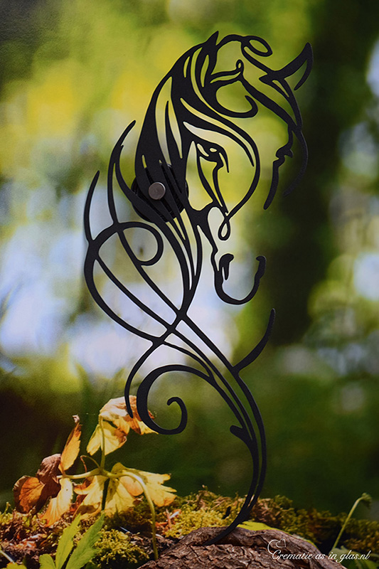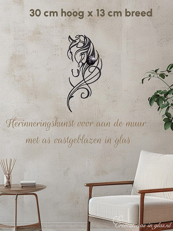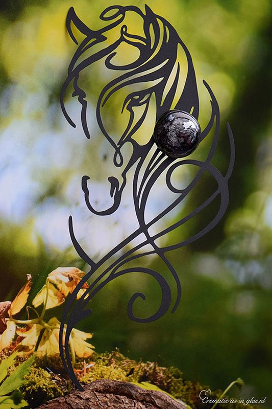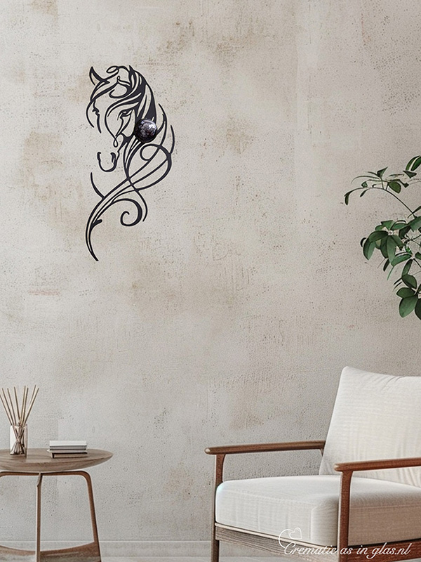 This memorial decoration of a horse head with a handmade glass urn as its core is a unique work of art for a wall that offers a lasting memory of a loved one. The horse head is made of matt black sprayed metal and has a beautiful, central piece of blown glass urn. In the round glass urn, the cremation ash is subtly melted into the glass, which offers a symbolic and intimate commemoration.