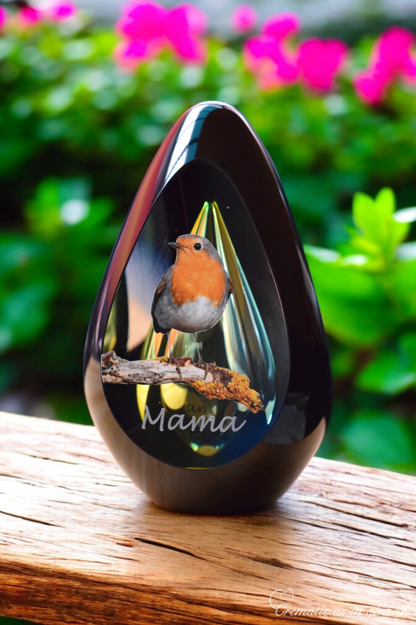Design urn of glass Diamond with green transparent ash chamber. On the urn, a picture of a robin and 1 name of your choice are placed by means of photo sign foil.