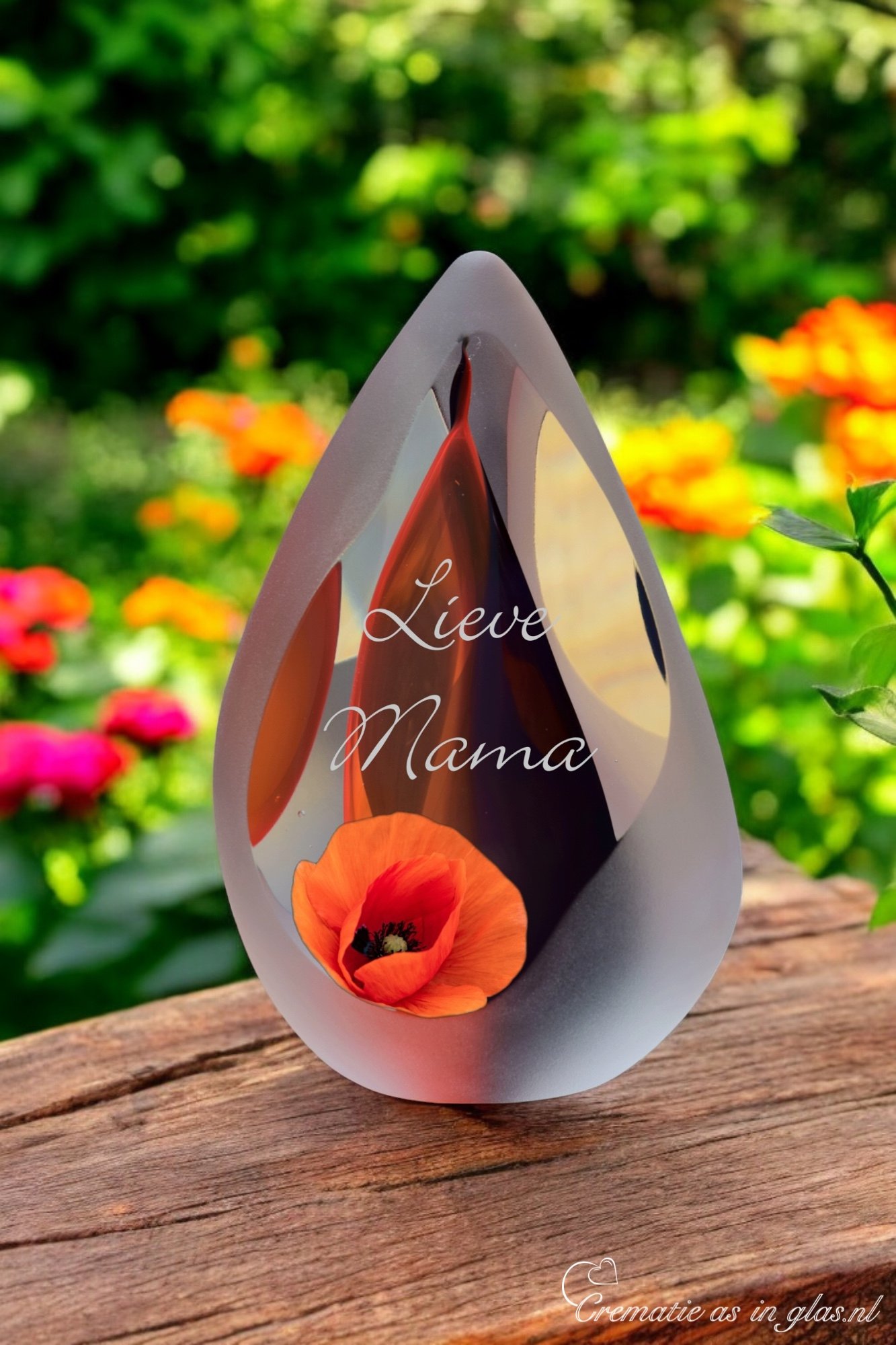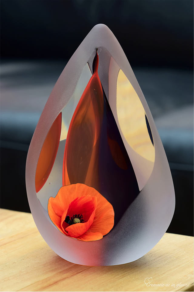 Design urn of glass Reflection with orange and black transparent ash chamber. An image of a poppy and possibly 1 name are placed on the urn by means of photo sign foil.