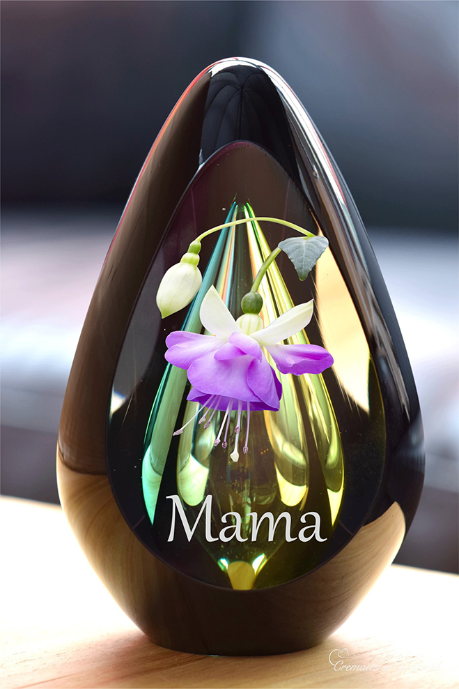 Design urn of glass Diamond with green transparent ash chamber. On the urn, a picture of a fuchsia flower and 1 name of your choice are placed by means of photo sign foil.