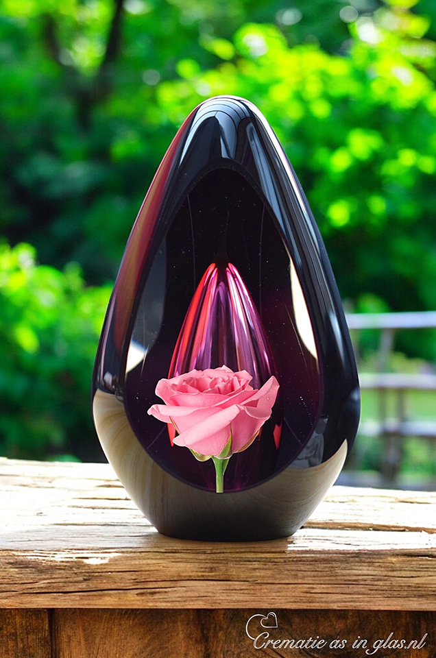 Design urn of glass Diamond with pink transparent ash chamber. An image of a pink rose and possibly 1 name is placed on the urn by means of photo sign foil.