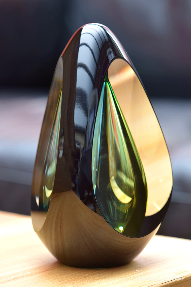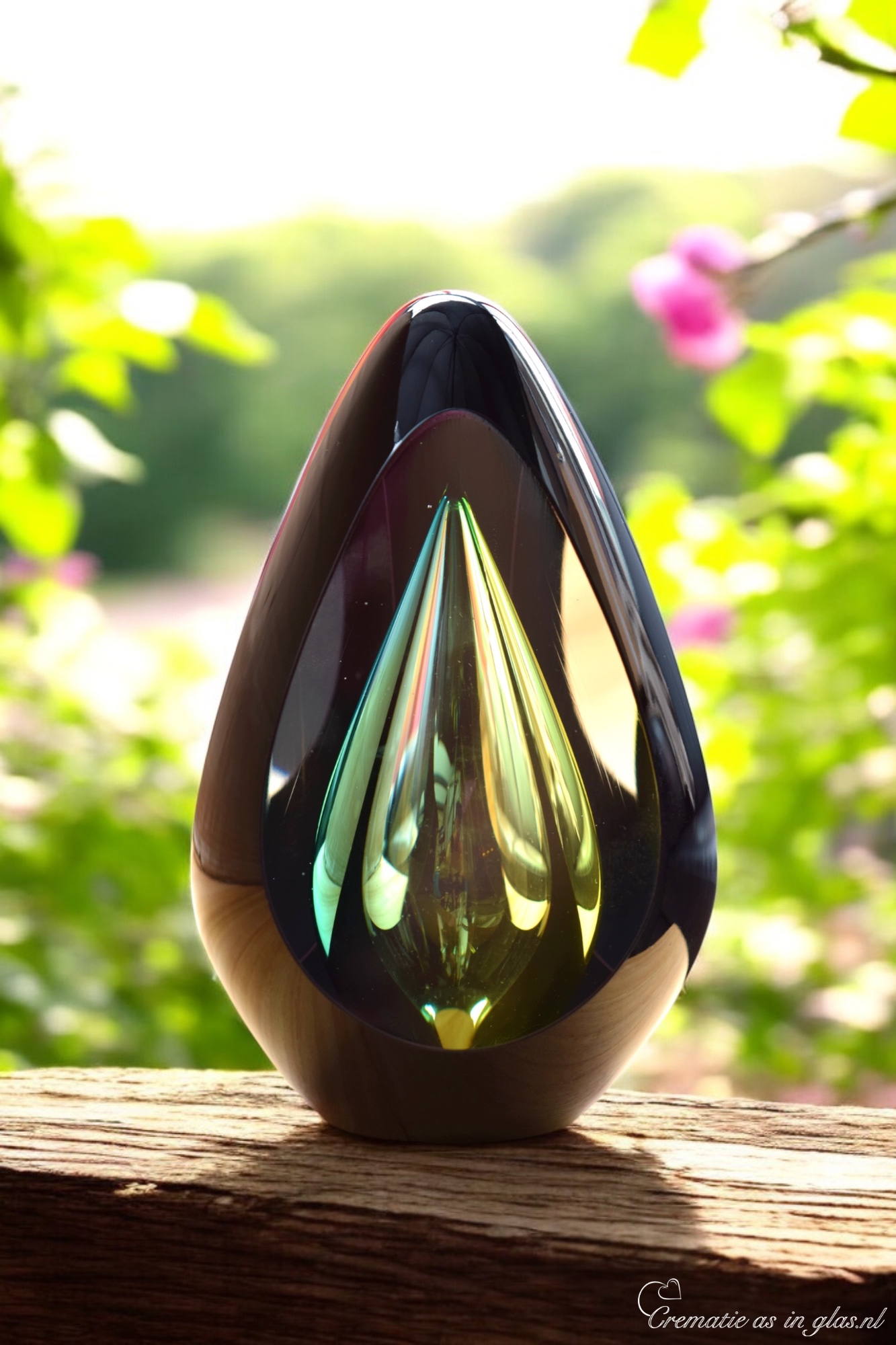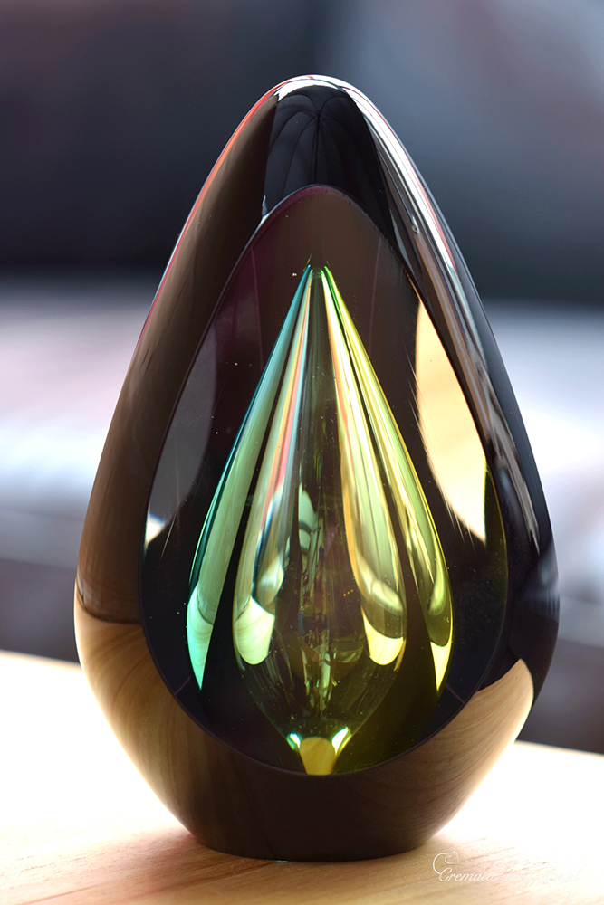 Design urn made of glass Diamond with green/yellow transparent ash chamber.