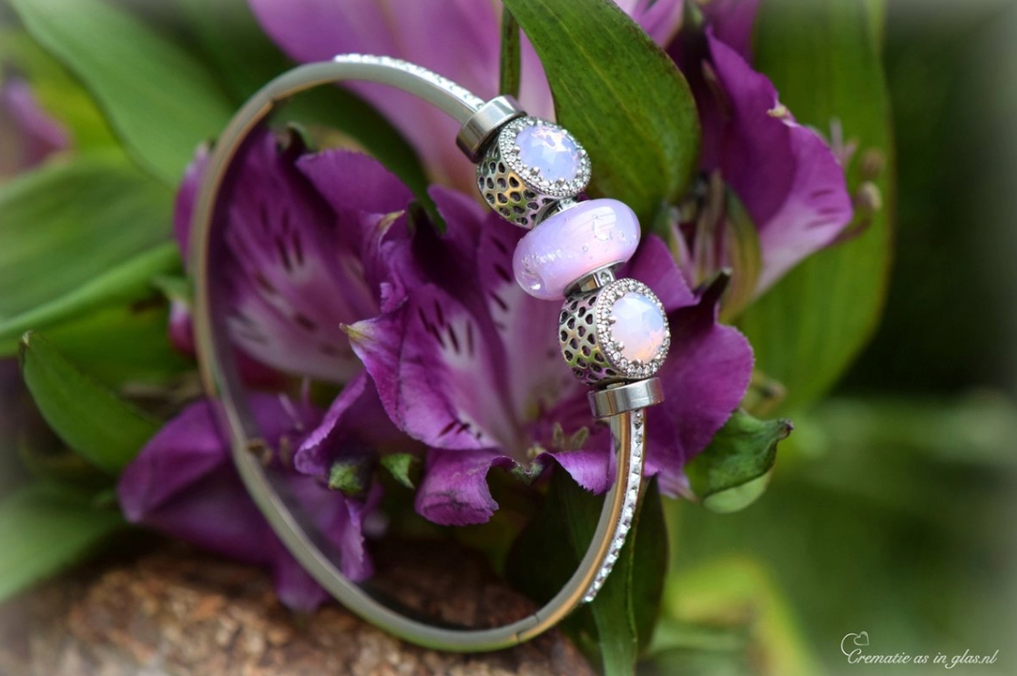 This delicate memorial bracelet contains cremation ashes that are not visible, fused into opal pink glass.