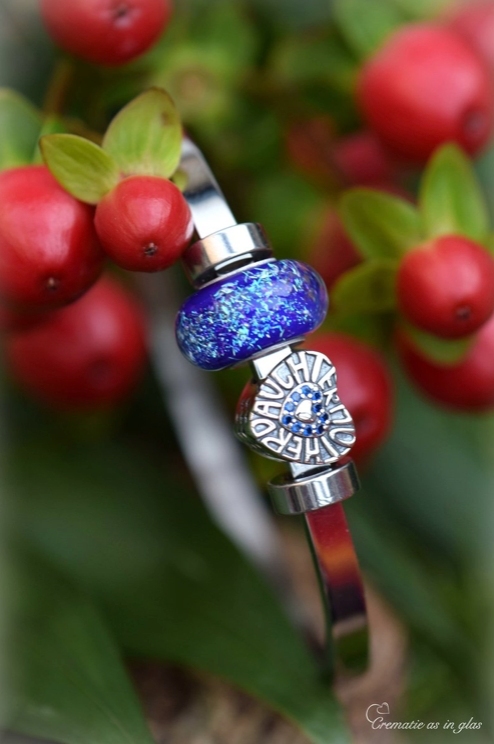 In this memorial bracelet, the cremation ashes are not visible and are fused into cobalt blue glass with a shimmering colour accent.