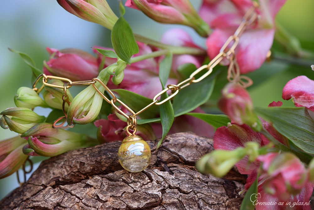 This women’s memorial bracelet made with cremation ashes and handcrafted glass is a beautiful and personal way to keep a loved one close. This subtle ashes keepsake for her combines elegance with emotional value, specially designed for women who wish to carry a tangible memory.