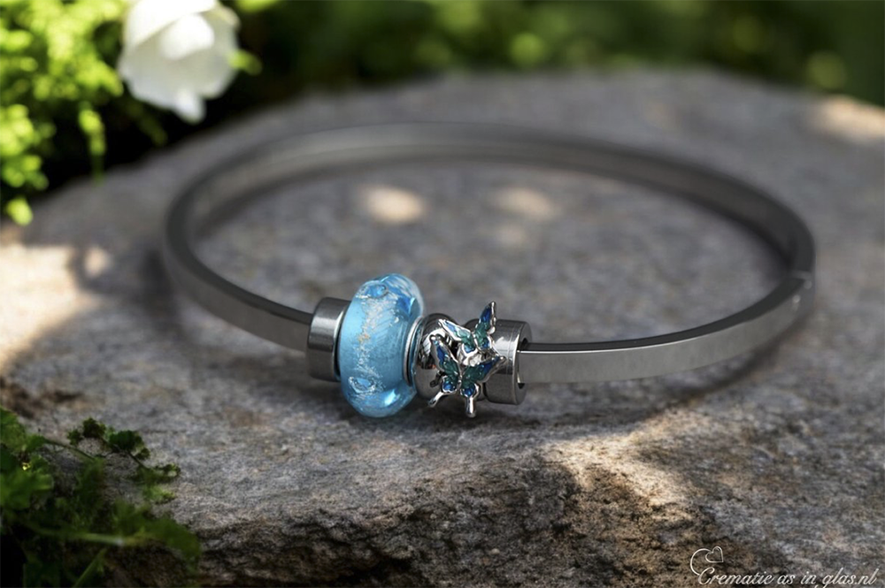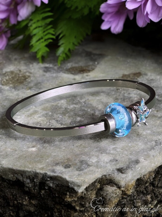 Memorial bangle bracelet with visible ashes in blue glass and double butterfly charm