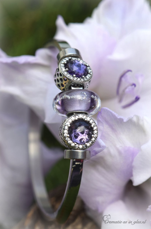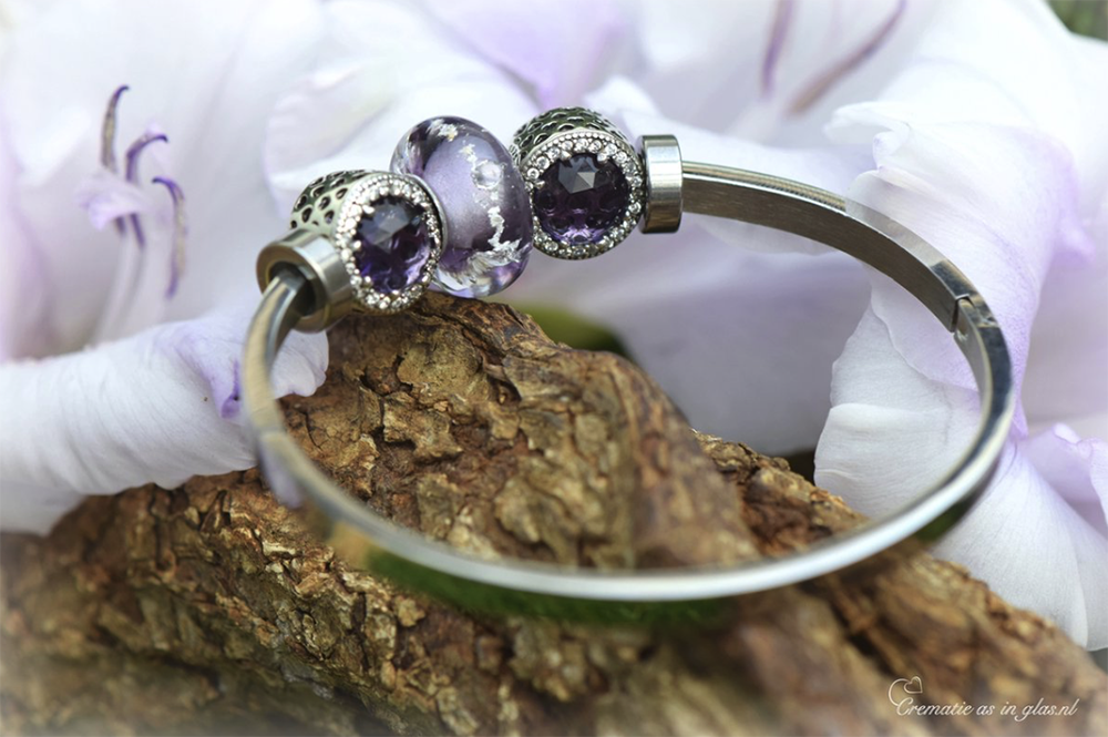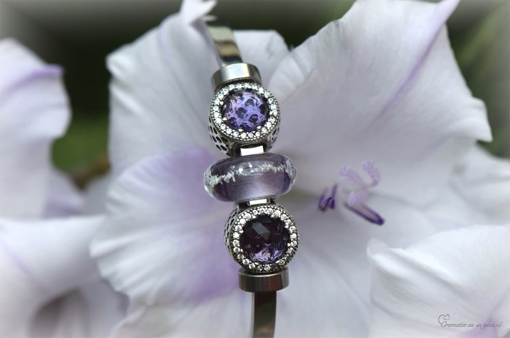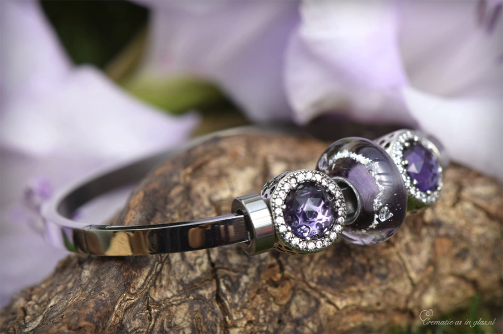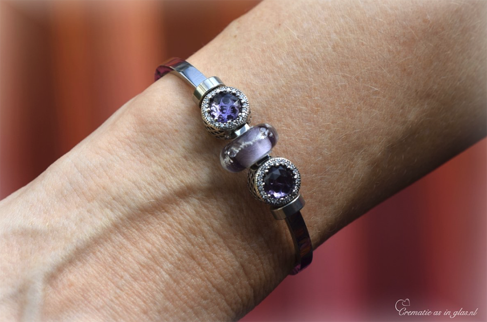In this memorial bracelet, the cremation ashes are clearly visible and are fused into transparent purple glass.