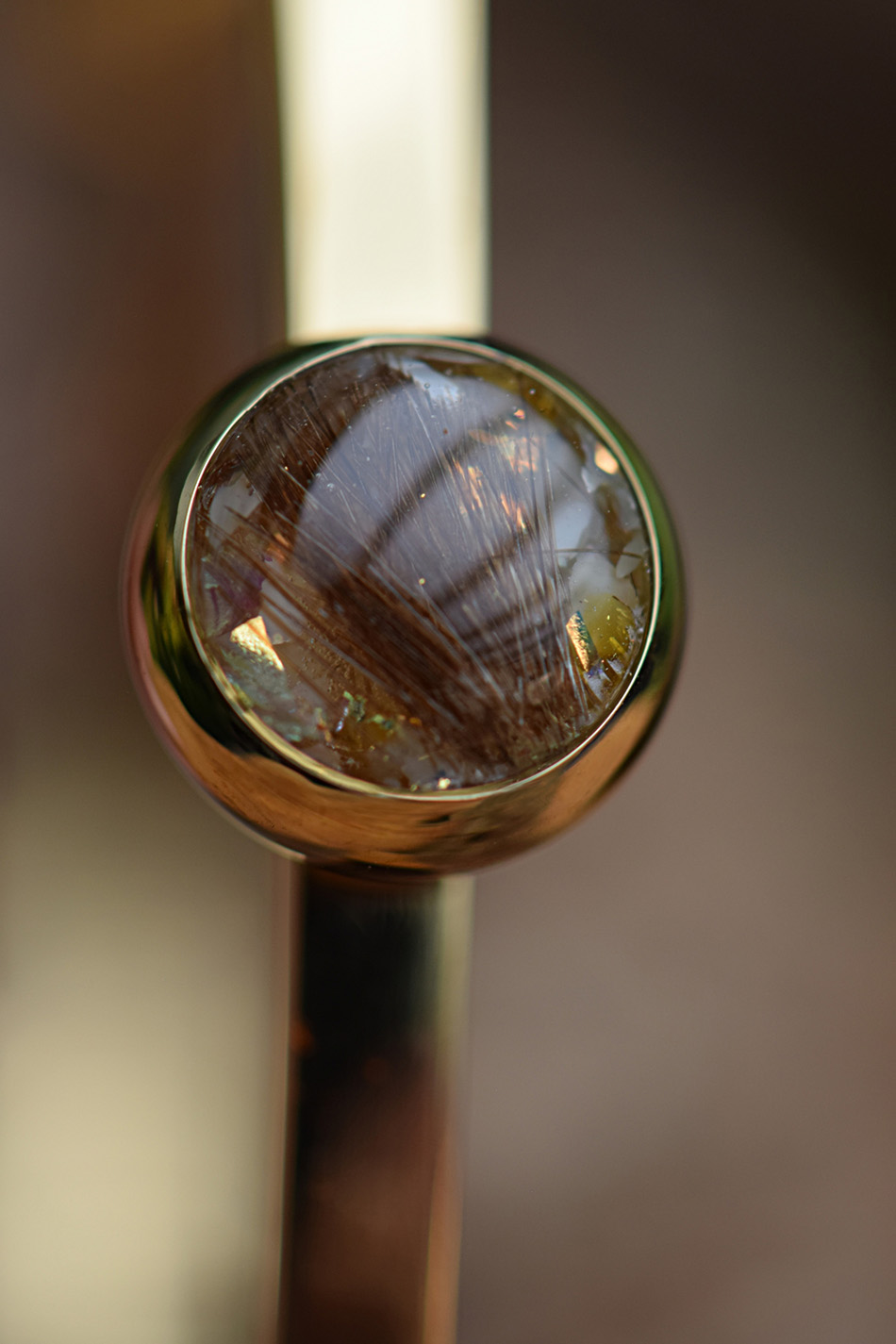 Gold-tone memorial bangle bracelet with visible hair or ashes on glass backing