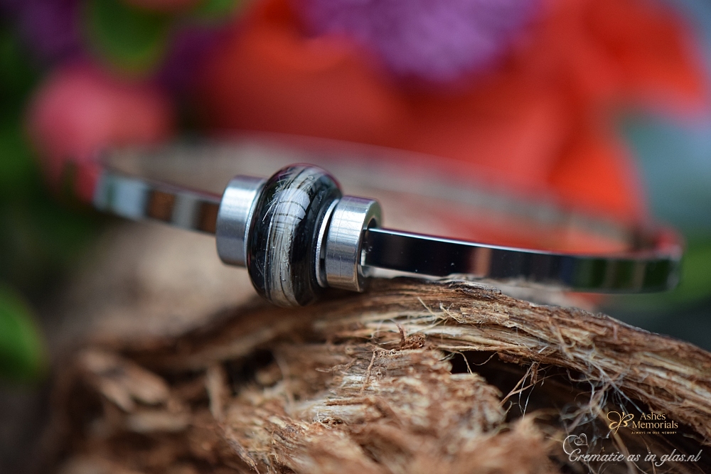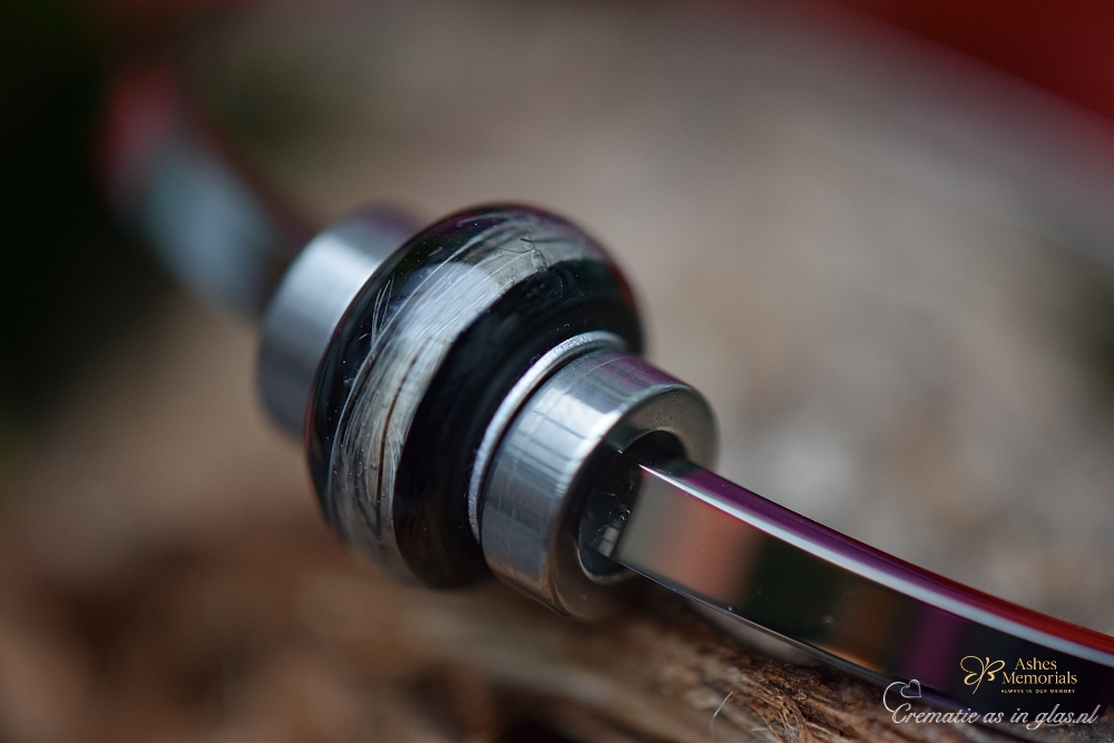 The bracelet features a black bead made of 316 stainless steel in which a lock of hair from a loved one is carefully incorporated. The hair is placed inside the bead and then finished with a clear protective resin layer, ensuring that the strands are safely encapsulated and well protected.