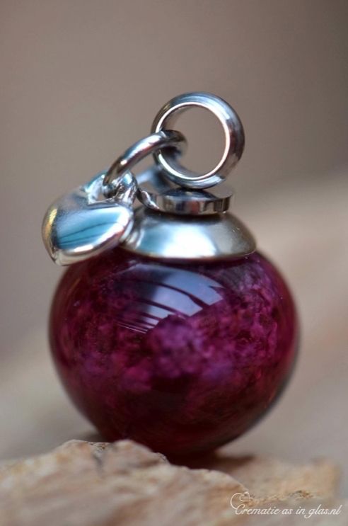 In this memorial pendant for her, a small amount of cremation ashes is subtly visible inside the transparent wine red glass. If preferred, you may choose a different glass color where the ashes remain visible – this can be discussed after placing your order.