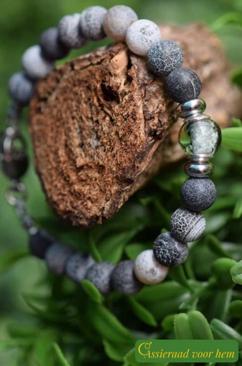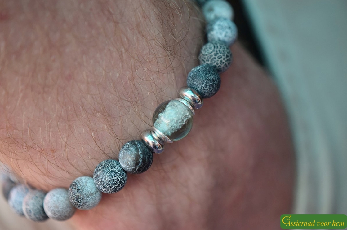 The ashes bead is combined with 8 mm natural Chalcedony Grey gemstone beads. These stones have been scientifically examined by Naturalis and are confirmed to be genuine stone. The surface of these beads has a coating or colour treatment, but the solid structure of the stone remains unchanged — only cut and polished.