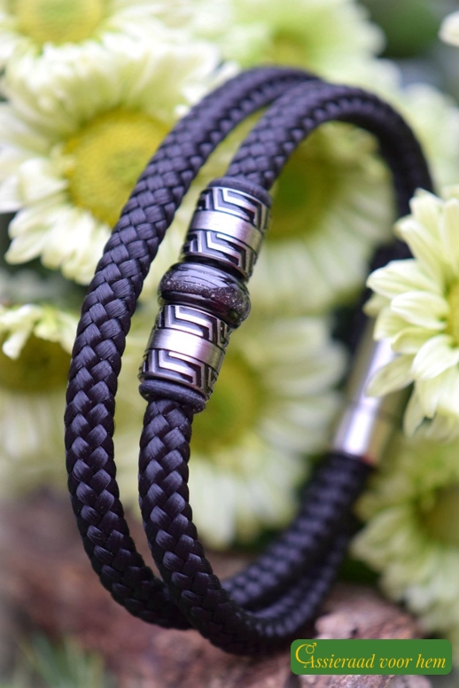 The Sail-Rope bracelet is made from a strong 6 mm black band with a very flexible and comfortable fit. Sail Rope is a highly durable braided polyester material, smooth to the touch and easy to wear. Thanks to its strength and resilience, it is also commonly used in sailing.