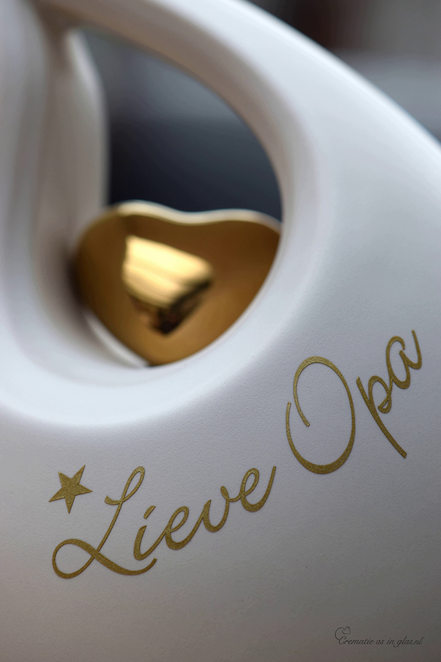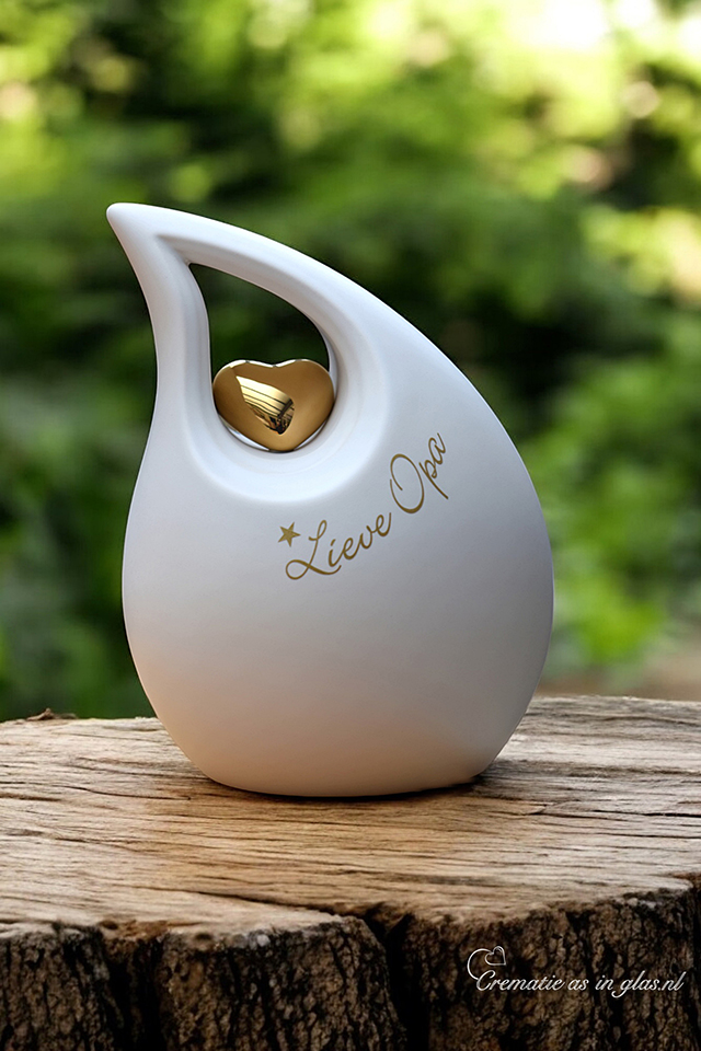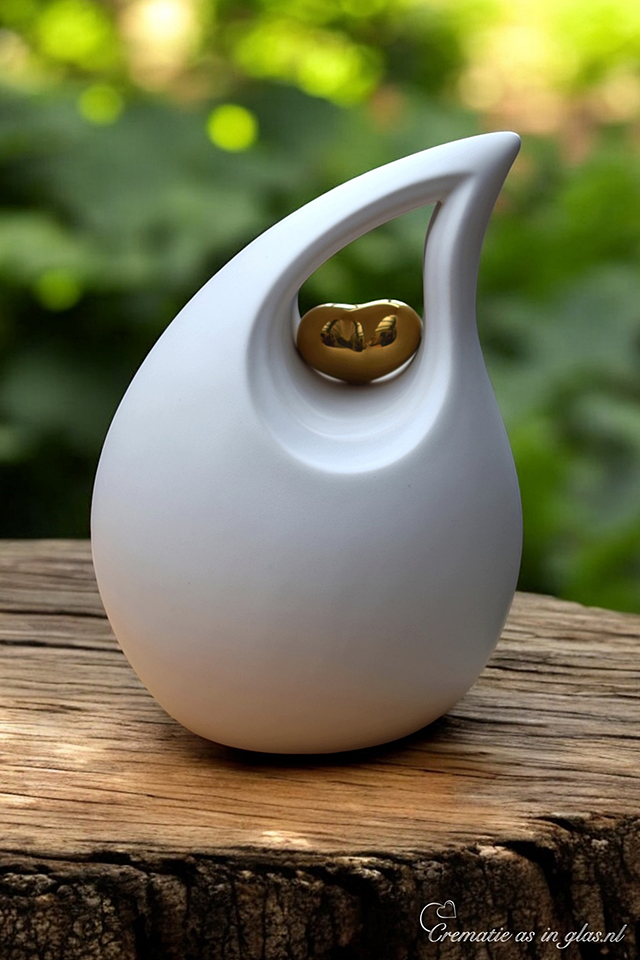 With a high quality metallic gold colored sign foil the letters and symbols are placed on this slanted tear urn. This urn has a capacity of 3.8 liters. There is a gold colored heart on this matt white ceramic urn.