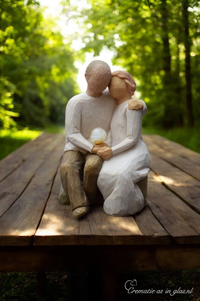 The figurine itself does not contain ashes – the urn is the actual commemorative element. The result remains subtle and in harmony with the soft, serene look of Willow Tree.