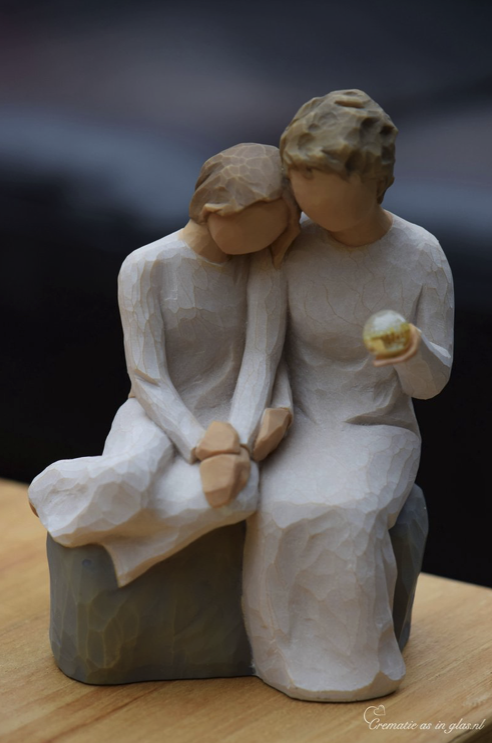 The figurine itself does not contain ashes – the urn is the actual commemorative element. The result remains subtle and in harmony with the soft, serene look of Willow Tree.