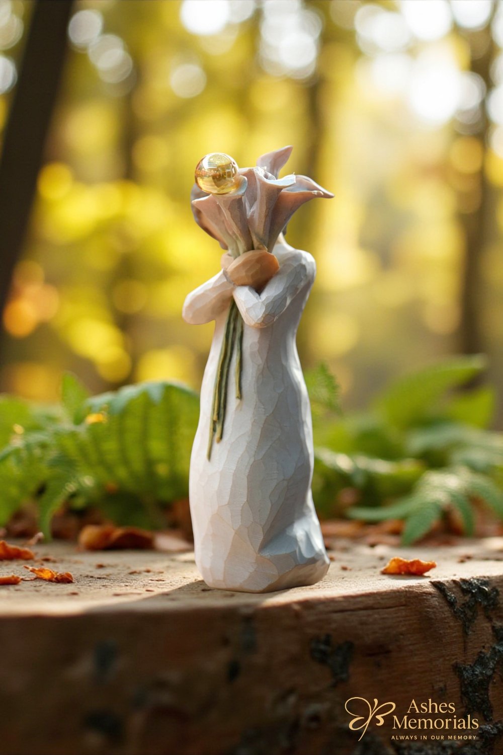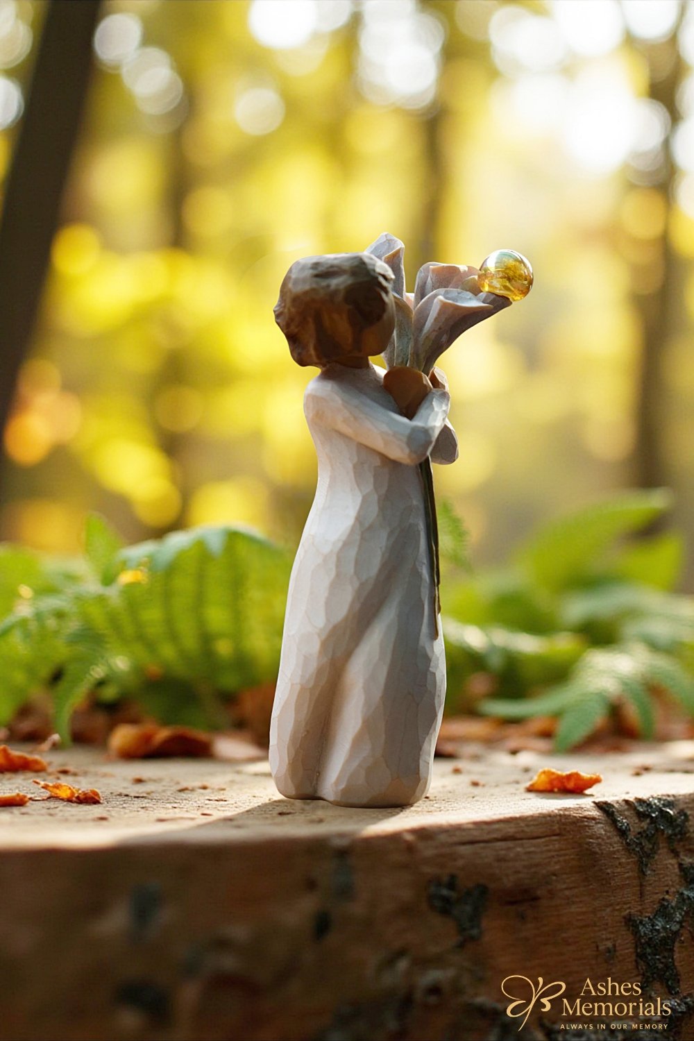 Beautiful Wishes is a graceful Willow Tree figurine featuring a woman holding a bouquet of elegant calla lilies – a symbol of love, happiness, and good health. A handcrafted glass mini urn in warm gold and transparent tones is delicately attached, designed to hold a small amount of ashes or a lock of hair inside the urn from a loved one or cherished pet. This memorial piece is carefully crafted to offer a subtle yet meaningful way to keep someone’s memory close.