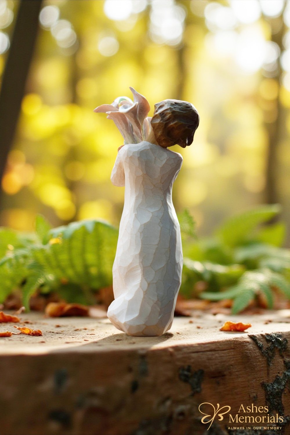 The figurine itself does not contain ashes – the urn is the actual commemorative element. The result remains subtle and in harmony with the soft, serene look of Willow Tree.